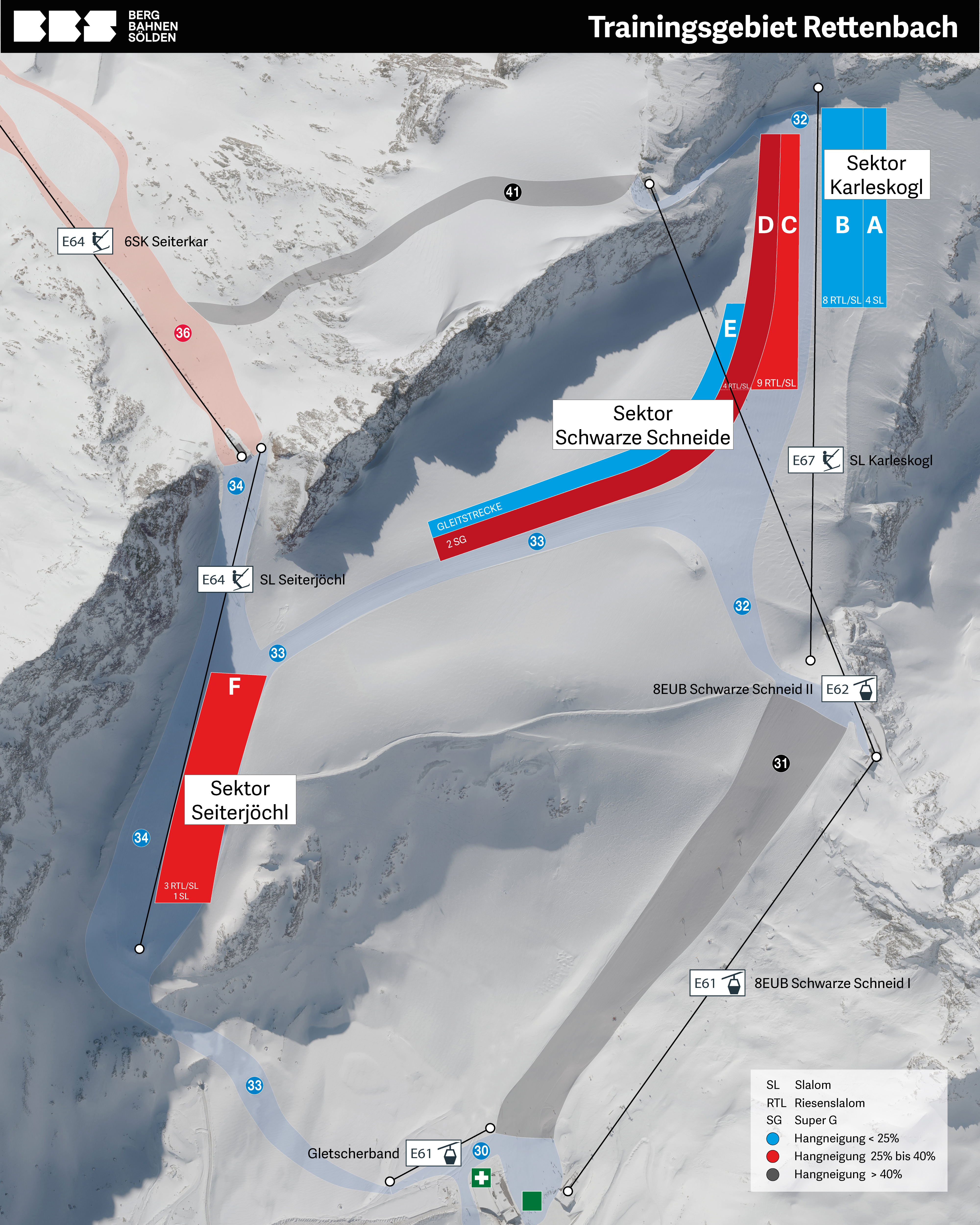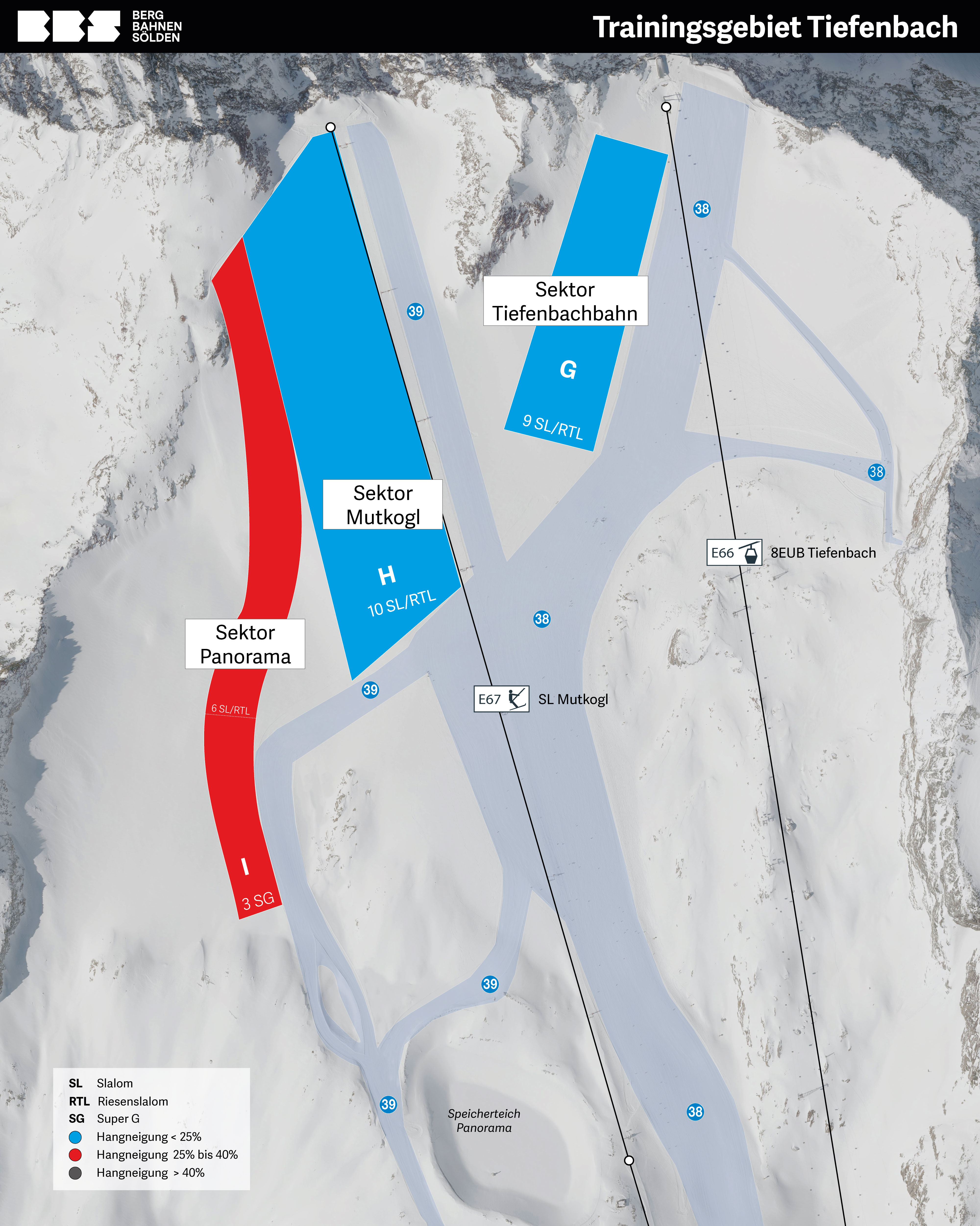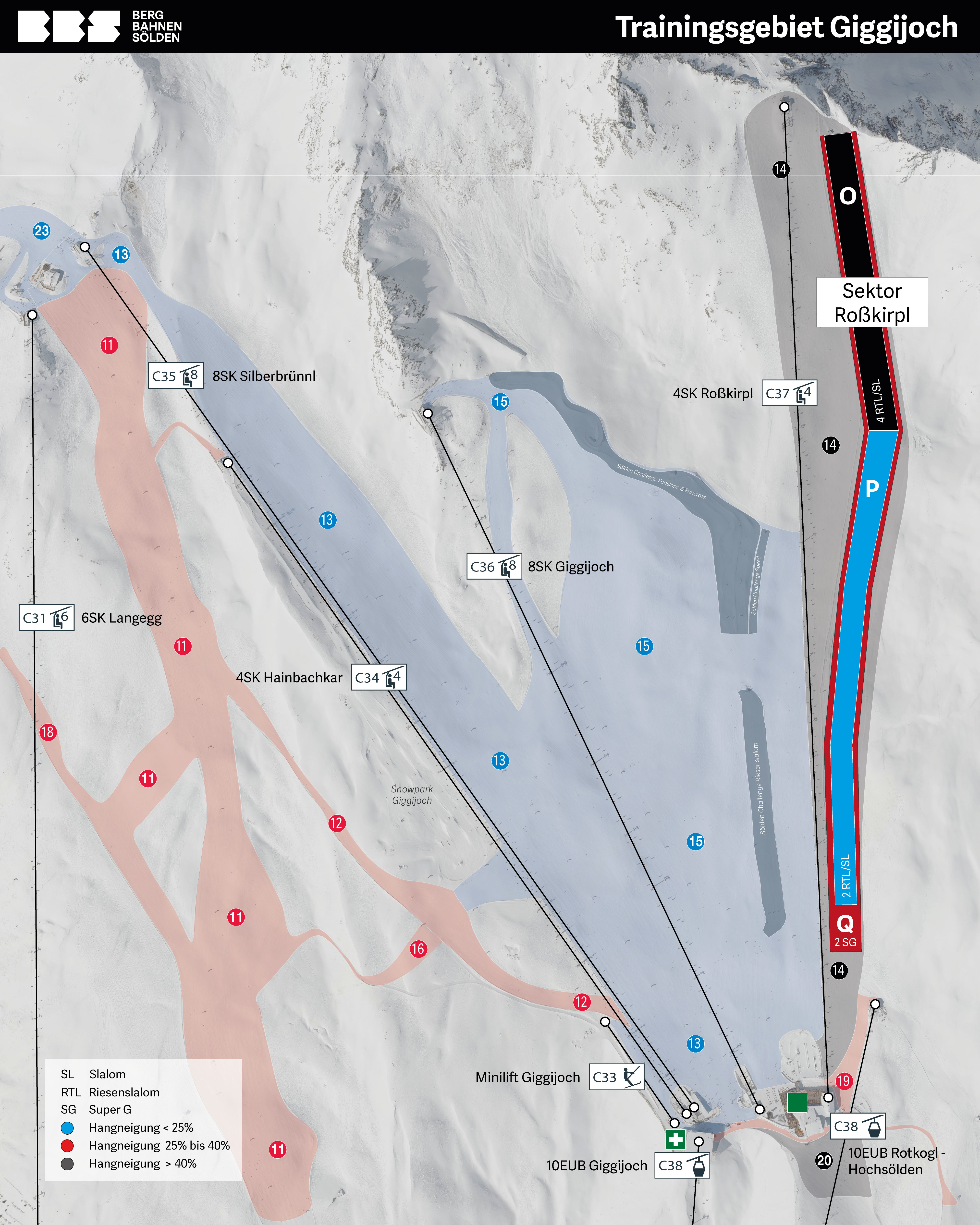 Als besonderen Service weisen die Bergbahnen Sölden eigene Trainingspisten am Rettenbach- und Tiefenbachgletscher bzw. im Winter am Giggijoch aus. Die Bereiche decken unterschiedliche Schwierigkeitsgrade für alle Disziplinen ab.